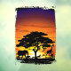 Atemberaubender, heller und Friedlicher Sonnenuntergang auf der wilden afrikanischen Savanna Landschaft mit wilden Tierformen. Ursprünglich mit Hi Quality / Hi Resolution Vector Graphic Art Technique Copyright BluedarkArt TheChameleonArt erstellt.