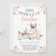 Laden Sie Ihre Freunde ein, Ihr kleines wild irgendjemandes Geburtstag mit dieser niedlichen Rotwildgeburtstagseinladung zu feiern, die Rotwild, einen Vogel und hübschen Blumen kennzeichnet.