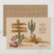 Die Wild West Rustic Wüste Animals Graphic Birthday Invitation Set die Szene mit handgezeichnet Kakteen, Weisheitsgras und einem heulenden Coyote unter einem Sonnenuntergang. Ein rosa Cowgirl hat einen Hut und stickt Erholung gegen ein Wagenrad, während ein Holzschild den Namen des Geburtstagsmädchens anzeigt. Dieser individuell gestaltbare Cowgirl-Geburtstag lädt Sie ein, rustikalen Charme mit spielerischem Western-Flair zu verbinden und ist somit ideal für ein Girls Cowboy Party oder Western auf dem Lande.