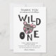 Niedlicher Geburtstag danken Ihnen zu kardieren für den 1. Geburtstag Ihres Jungen! Illustration eines Brüllenbären mit den rosa Backen, die einen roten und weißen Partyhut tragen. Der Typografietext, der den Bären umgibt, sagt "WILDES." Der Nichterfüllungstext dankt den Gästen für die Herstellung den Geburtstag ein "wildes" und für ihre Geschenke und Anwesenheit. Fertigen Sie dieses Produkt besonders an, indem Sie den Namen Ihr Kindes an der Unterseite addieren.