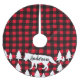 Dieser Weihnachtsbaumrock hat ein kariertes Muster des Karos des roten und schwarzen Büffels mit einer Silhouette des weißen Wolfs an der Unterseitenfront des Rockes, der Ihren Familiennamen im rustikalen Skript enthält. Ein was für fantastischer Baumrock für eine Kabine oder ein Jagdhäuschen!