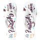 Ein Paar weiße Flip-Flops mit sommerlichem Design. Das Design umfasst das Wort "Sommer" in einem stilisierten, kursiven Schriftart, zusammen mit verschiedenen Beachbildern wie Muscheln, Liegestühlen, Flip-Flops, Lifebuys und Sonnen. Die Farbpalette ist hell und freundlich, mit Blau-, Orange- und Brauntönen vor weißem Hintergrund der Flip-Flops. Der Gesamtstil ist spielerisch und sommerlich, ideal für einen Tag am Strand oder einen lässigen Ausflug.