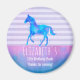 Ein personalisierter Geburtstagmagnet mit einem hübschen Aquarellpferd in Blau und lila Farben. Laufen wild und frei. Set auf einem horizontalen, lila gestreiften Hintergrund mit einem Vintagen Flair. Ein blau-rosa Wasserfarbenrand lag am Boden.