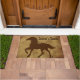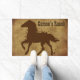 Personalisieren Sie mit Ihrem Namen, Namen Ihres Landes Zuhause oder Ranch. Hübscher schwarzer Hengst in rustikaler Farbe wirkt auf braunen rustikalen Hintergrund.