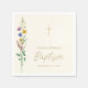 Dieses florale Tauf-Papiertuch zeigt Wildblumen und ein Kreuz mit goldener Typografie auf einem weichen cremefarbenen Hintergrund.