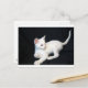 Eine spielerisch weiße Katze mit schwarzem Hintergrund bietet ein genderneutrales und unterhaltsames Bild, das Ihr Lieblingsprodukt aufnimmt.
