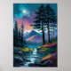 In diesem digitalen Meisterwerk im Ölmalereistil entfaltet sich der Zauber des Abends. Eine ruhige Wildnis wird lebendig, wenn sich ein Bach von einem ruhigen See schlängelt, der von einem üppigen Baumkronenwald umringt wird. Majestätische Berge stehen in der Ferne, während die verblassende Sonne eine Szene zeitloser Schönheit mit ihrer goldenen Touch ergänzt.