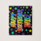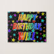 This lively, exciting, birthday-themed jigsaw puzzle design feature the message "HAPPY BIRTHDAY, WILL" with the characters having a colorful rainbow spectrum inspiriert gradient pattern, along with a vibrant field background pattern. A colorful puzzle like this might be used to send birthday wishes to somebody named Will or William. [~ Z0000468]