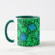 Tasse des Kaffees in einem Vintagen William Morris blumengestromten Damastmuster aus anemonischen Blume und Blätter, digital verbessert und farbig - smaragdgrüne Blätter und Blume in Cerulean- und Kobaltblau auf einem dunkelgrünen Hintergrund