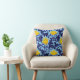 Throwkissen in einem Vintagen Blumendamastmuster Williams Morris der Anemonen-Blumen und -Blätter, digital erhöht und gefärbt - Marine-/Indigoblau-Blätter, mit Blumen in den Schatten des Senfgelbs, auf einem hellen Himmelblauhintergrund