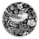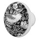 Keramik-Knopf in einem William Morris Art Nouveau-Fliesen-Muster, die einen Vogel, wilde Blume, Blätter und wilde Erdbeeren in Silbergrau / grau und weiß, vor einem schwarzen Hintergrund darstellen