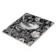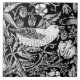 Keramik-Kacheln in einem William Morris Art Nouveau-Fliesenmuster, digital verstärkt und farbig, mit einem Vogel, wilden Blume, Blätter und wilden Erdbeeren in silbergrauen, grauen und weißen Farbtönen, mit schwarzem Hintergrund