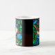 Tasse in einem Jugendstil-Stil, digital verstärkt und farbig, in Beige und Braun von William Morris, mit lebhaften, krautblauen Blumen, grünen Blätter und wilden Erdbeeren, auf schwarzem Hintergrund