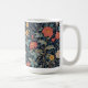 A beautiful, intricate William Morris floral pattern coffee mug featuring stylized flowers in salmon, teal, yellow, and cream against a deep navy background. Perfect for adding timeless Arts Crafts decor style to any kitchen or office. This classic, rich design is ideal for fans of historic textile prints. Created by Simply Farmhouse Press.