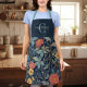 A beautiful, intricate William Morris floral pattern apron featuring stylized flowers in salmon, teal, yellow, and cream against a deep navy background. Perfect for adding timeless Arts Crafts decor style to any kitchen. Complete the classic look with a personalized monogram. This classic, rich design is ideal for fans of historic textile prints. Created by Simply Farmhouse Press.