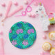 Papier-Teller in einem Vintagen William Morris, Jugendstil, floraler Druck stilisierter Chrysanthemen, digital verstärkt und farbig, in Weich- und Türkistönen, Ceruléblau, Violett / Lavendel, auf aquamarinem/Pfauenhintergrund