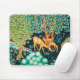 Mousepad in einem William Morris Tapestry-Design von drei Hirschen neben einem Bach in einem Fantasy-Wald umgeben von Bäumen in sanften grünen und aqua Schattierungen, vor einem dunkelindigoblauen Hintergrund