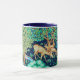 Tasse in einem William Morris Tapestry-Design von drei Hirschen neben einem Bach in einem Fantasy-Wald in Schattierungen von weichen Grün und Aqua, vor einem dunkelindigoblauen Hintergrund