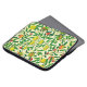 Laptop-Laptop in einem William Morris Art Nouveau Muster von Zitronen, Granatapfelsen und Pfirsichen, mit Blüten, auf grünen Zweigen - Früchte in Zitronengelb und Korallenorange, mit grünen Blätter, vor einem gemusterten, gelben und weißen Hintergrund