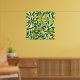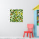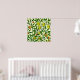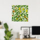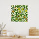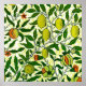 Drucken Sie in einem William Morris Art Nouveau-Muster aus Zitronen, Granatapfelsen und Pfirsichen, mit Blüten, auf grünen Zweigen - Früchte in Gelb und Korallenorange, mit grünen Blätter, vor gemustertem, gelben und weißem Hintergrund