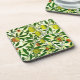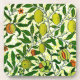 Untersetzer im William Morris Art Nouveau-Jugendstil-Muster von Zitronen, Granatapfeln und Pfirsichen, mit Blüten, an grünen Zweigen - Früchte in Gelb und Korallenorange, mit grünen Blätter, im gemusterten, gelben und weißen Hintergrund