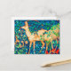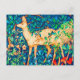 Postcard in einem William Morris Tapestry-Design in einem Fantasy-Wald-Ambiente - hellgesprenkeltes Hirsch in einem üppigen, tiefblauen und grünen Hintergrund von Blätter und Blume, akzentuiert mit roten Tulpen