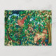 Postcard in einem William Morris Tapestry-Design eines Fuchses und eines Fasans in der Luft in einem Fantasy-Wald Umgebung grünen Blattwerks und Obstbäumen