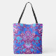 Tasche in Vintagem William Morris-Muster aus Hyazinthen, Tulpen und Blätter, in Aqua- und Kobaltblau, mit Fuchsienfarben und blassrosa Akzent auf einem lila Amethystboden