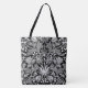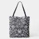 Tasche in Vintager William-Morris-Manier mit Hyazinthen, Tulpen und Blätter in silbergrauen, grauen und weißen Farbtönen auf schwarzem Hintergrund