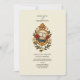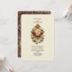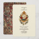 Eine klassische Einladung im Old World Stil mit einem königlichen Medaillon, Blume Lorbeer und zwei Hochzeitsringen. Auf der Rückseite steht ein Blumendruck im William Morris-Stil.