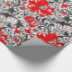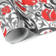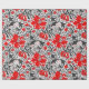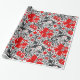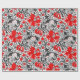 Umhüllungspapier in einem Vintagen Blumendruck von William Morris aus stilisierten Lilien und Iren, digital verstärkt und farbig, in Grautönen, Grautönen und schwarzem Blattwerk, mit tiefroten Blume, auf weißem Grund