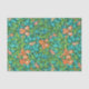 Papiertücher in einem William Morris, Art Nouveau, Textilien von Irises und Blätter, digital verstärkt und farbig, in Orange, Kalkgrün und Weichaqua, auf einem tiefen türkisfarbenen Hintergrund