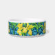 Eine Schüssel mit Haustieren in William Morris, Jugendstil, Textiliendruck von Reisen und Blätter, digital verstärkt und farbig, in goldgelb, grün und weichblau, auf einem tiefkobaltblauen Hintergrund