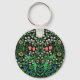 Schlüsselanhänger in einem Vintagen William Morris Jakobus-Tapete-Muster aus Korallenrosa Tulpen, gelben Gänsen, blauen Veilchen, zarten, weißen Blüten und Jade-grünem Blattwerk auf schwarzem Hintergrund, digital verstärkt und farbig