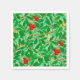 Papierservietten im William Morris Art Nouveau Textilmuster aus lychebäumen und Blätter in Limonen und tiefgrünen Farbtönen, mit roten Lychefrüchten und gelben Blüten auf hellgrünem Hintergrund