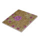Keramikfliese in einem Vintagen William Morris, Kunst Nouveau, Ringelblumendamastdruck des Blätter und der Blumen, digital erhöhte und färbte, in den Schatten von hellbraunem und von Beige, betont mit violettem Lila und rosa, auf einem dunklen schokoladenbraunen Hintergrund