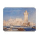 Rhodes. Joseph Mallord William Turner (1775 - 1851). Eine schöne Jahreszeit in Rosa und Blau. Im Vordergrund befinden sich Boote und Schiffe in der Bucht in der Nähe der Stadtmauer, im mittleren Bereich befindet sich ein hoher Turm. Im Hintergrund befindet sich eine Stadt mit Steinhäusern. Reproduktion berühmter Kunstbilder im öffentlichen Bereich.
