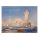 Rhodes. Joseph Mallord William Turner (1775 - 1851). Eine schöne Jahreszeit in Rosa und Blau. Im Vordergrund befinden sich Boote und Schiffe in der Bucht in der Nähe der Stadtmauer, im mittleren Bereich befindet sich ein hoher Turm. Im Hintergrund befindet sich eine Stadt mit Steinhäusern. Reproduktion berühmter Kunstbilder im öffentlichen Bereich.