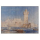 Rhodes. Joseph Mallord William Turner (1775 - 1851). Eine schöne Jahreszeit in Rosa und Blau. Im Vordergrund befinden sich Boote und Schiffe in der Bucht in der Nähe der Stadtmauer, im mittleren Bereich befindet sich ein hoher Turm. Im Hintergrund befindet sich eine Stadt mit Steinhäusern. Reproduktion berühmter Kunstbilder im öffentlichen Bereich.