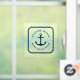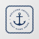 Fensterklemme mit einem dunkelblauen nautischen Anker, umgeben von einem Seilrand, dem Text "Begrüßung an Bord" und Ihrem eigenen Bootsnamen.