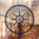 Fensterklemme mit dunkelblauem, elegantem Schiffrad- und Seilemblem mit individuellem Text "Begrüßung an Bord" und Schiffsname auf einem klaren Hintergrund.
