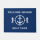 Willkommen an Bord mit Ihrem Personalisierten Bootsnamen mit einem Custom Seepferd und Nautical Anchor in Weiß auf einem stilvollen Navy Blue Doormat.