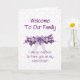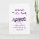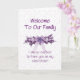 Herzlich willkommen eine neue Stilschwester in Ihrer Familie mit einer schönen lila Themenkarte. Schöne Blume mit einem lila oder lila Thema und einem großen Bogen, Copyright Norma Cornes.