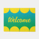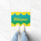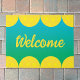 Pickleball Begrüßungsmatte in Gelb und Grün. Das Design umfasst eine Reihe von gelben Pickleball-Kugeln an den oberen und unteren Rändern und einen blau-grün-gestuften Hintergrund.