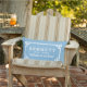 Stilvolle Lumbalkissenkonstruktion mit weißgriechischer Hauptgeometrie und Monogramm, die mit einem verheirateten Familiennamen oder Familiennamen personalisiert werden können, feststehendem Datum (das Jahr verheiratet oder das Jahr, in dem das erste Kind geboren war). Passen Sie den Himmel / den blauen Hintergrund an, um sich mit Ihrer Außendekoration abzustimmen.