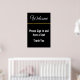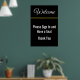 "Welcome" erscheint in einem eleganten weißen Drehbuch oben auf diesem schwarzen Geschäftspopster. "Bitte anmelden und einen Platz haben" erscheint unten in weißem Text. Die Imitate Goldlinien sind nicht aus Folie.
