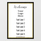 Oben werden in schwarzen Skriptformularen Text angezeigt, den Sie bearbeiten können, um eine benutzerdefinierte Nachricht zu erstellen. (Bild: Willkommen) Als Nächstes gibt es ein Display-Image, das Sie durch ein Foto oder Firmenlogo ersetzen können, falls gewünscht (Bild angezeigt: Ihr Logo hier). Zusätzliche Textzeilen werden unter dem Bild angezeigt. Sie können den Anzeigetext bearbeiten, um einen benutzerdefinierten Text zu erstellen. Der gesamte Text ist schwarz. Die Fensterverkleidung hat einen schwarzen und goldenen Rahmen mit Imitaten (nicht mit Folie).