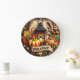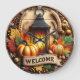 Diese festliche Uhr zeigt eine detaillierte Herbstszene mit einer großen, rustikalen Laterne, die das Zentrum beleuchtet. Die Laterne ist von bunten Kürbissen, Eicheln und einer Vielzahl von Herbstblättern in Rot-, Gelb- und Grüntönen umgeben. Ein Banner auf der Unterseite lautet "WELCOME" und das gesamte Design ist durch eine dekorative Seilleiste gerahmt. Das Uhrengesicht hat schwarze Hände und stilisierte Zahlen, Set vor einem Hintergrund aus Holzplanken.