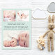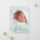 Eine einfache und elegante mint grüne, geschlechtsneutrale Geburtsankündigung. Die Vorderseite zeigt das Foto Ihres Neugeborenen, den vollständigen Namen, das Ankunftsdatum und die Geburtsdaten sowie "Willkommen" in einem stilvollen Schrift. Auf der Rückseite der Karte können Sie drei zusätzliche Baby-Fotos und Eltern- und Geschwisternamen hinzufügen, und ein Dankeschön, Besuchen oder andere Gefühle.