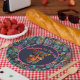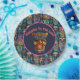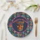 Eine helle Tiki Maske Luau Party Papierplatte in Blues und Pinks für einen hawaiianischen Luau